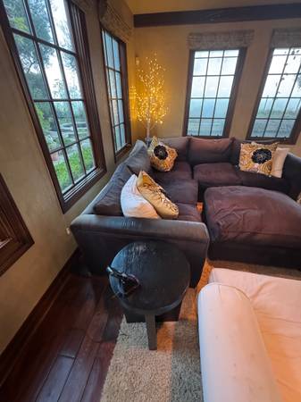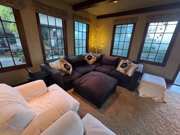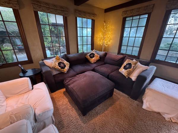 Stunningly comfortable and spacious couch...fully goose down feather filled! Comprised of 2 pieces (1) 57" long and (2) 97" long. Includes a 3' x3' ottoman.