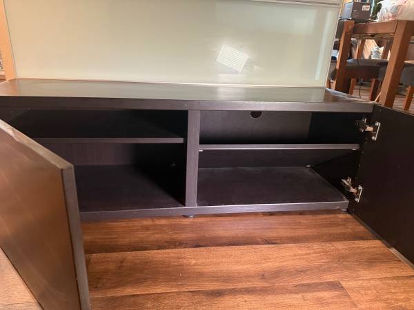 Framsta tv stand with back panels and hardware for TV. 47 length x 65 height. Glass portion is 47 length by 55 height. We had a 55” tv on it (sorry there isn’t a better photo!). You can put lights behind the glass. You can do a google search for Framsta to get a better idea. Shelf lost the bolts to hold it on right side, but that can be an easy fix.